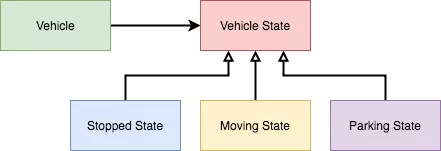 在我们的例子中我们将使用一辆汽车。我们的汽车可以处于停止的状态,它也能够处于移动中、或者自动停车状态。这辆汽车将会有它的功能,比方说刹车和停车。根据汽车所处的状态,使用不同的功能将会有不一样的效果。如果对停止状态的汽车发送刹车指令,将没有任何效果;而对一个正在自动停车状态的车发送刹车指令,将会使汽车取消它的停车操作。